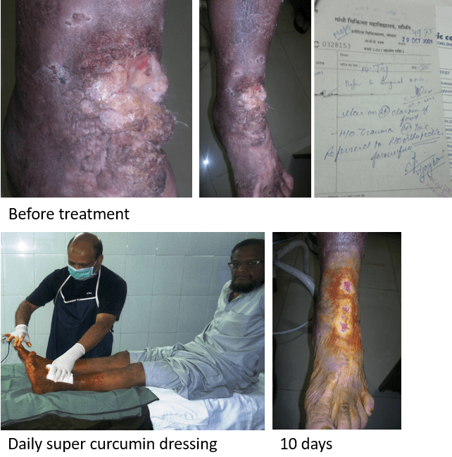 CASE STUDY 1: Suffering from leprosy since last 20 years, had non healing, fungating tumor like growth with ulcers and pus discharge from both legs (no sensation in extremities). Traditional treatments were ineffective.