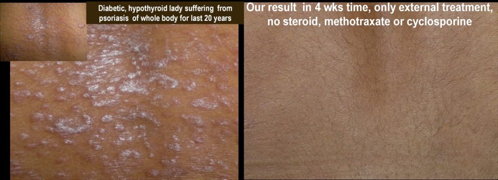 The innovative herbal wound dressing (super curcumin) is only externally applied and is an effective solution in treating psoriasis as seen in the case studies provided below. No side effects or other complications were observed.